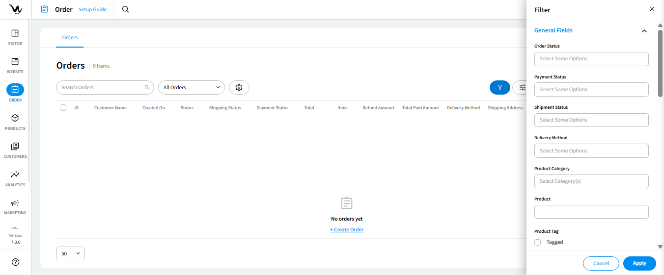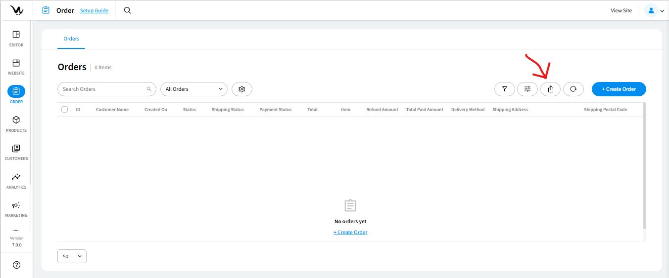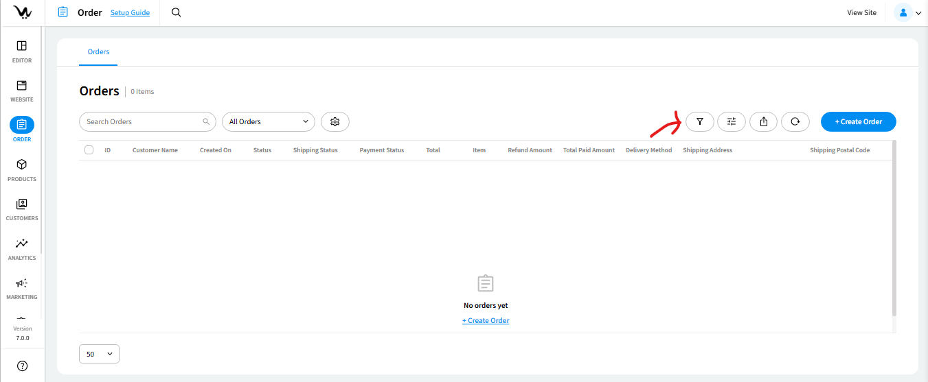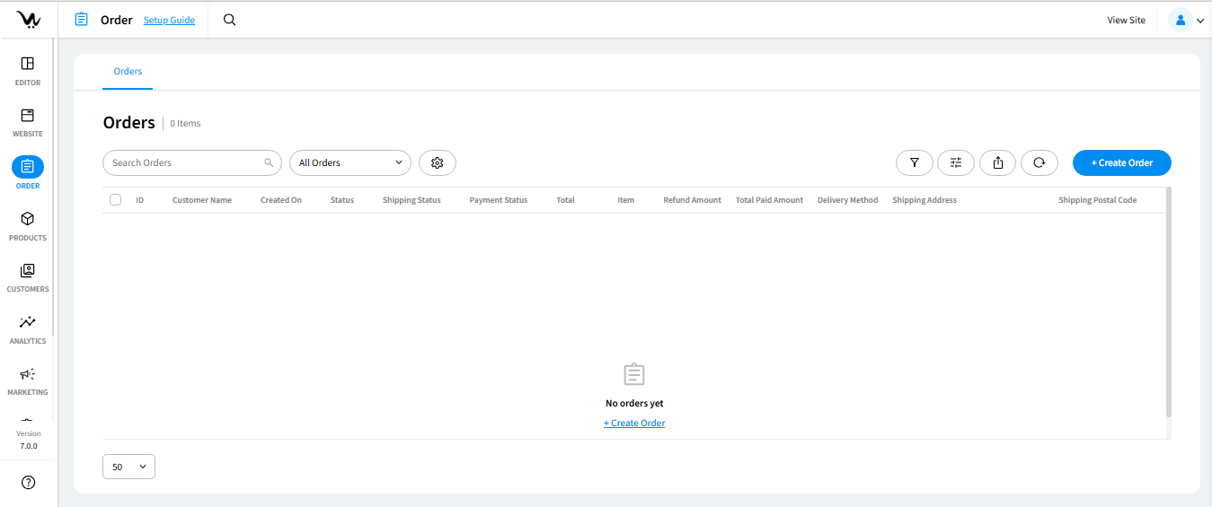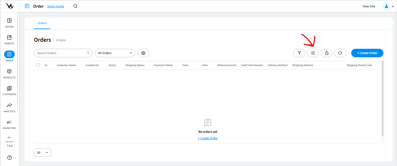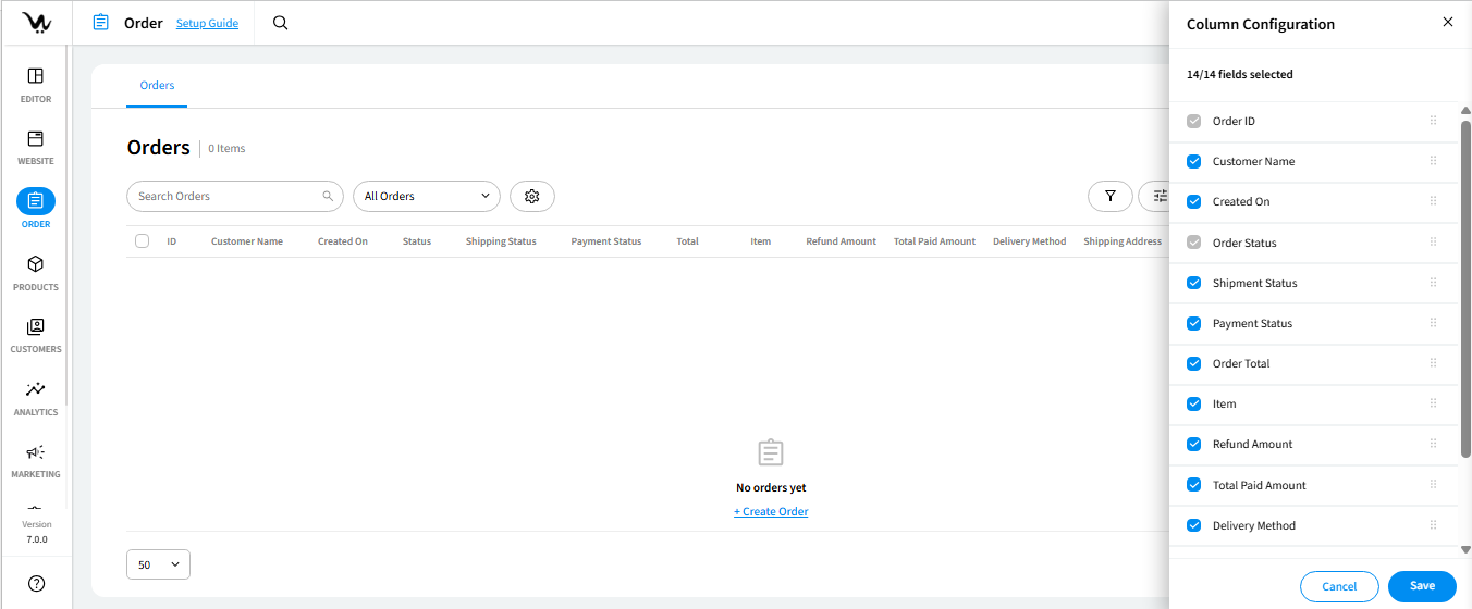 Entering the Orders section, you’ll find the order list, displaying default information like Order ID, Customer Name, Order Date, Order Status, Shipment Status, Payment Status, and Order Total.