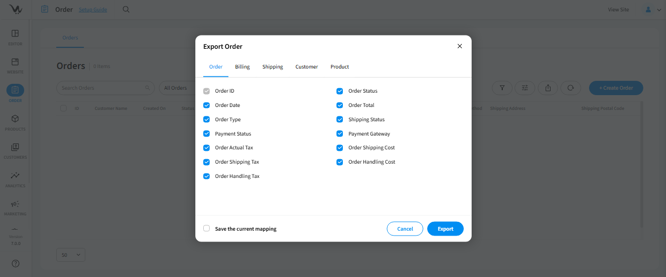 - In the pop-up, choose properties from the Order, Billing, Shipping, Customer, Product, and Order Custom Fields.