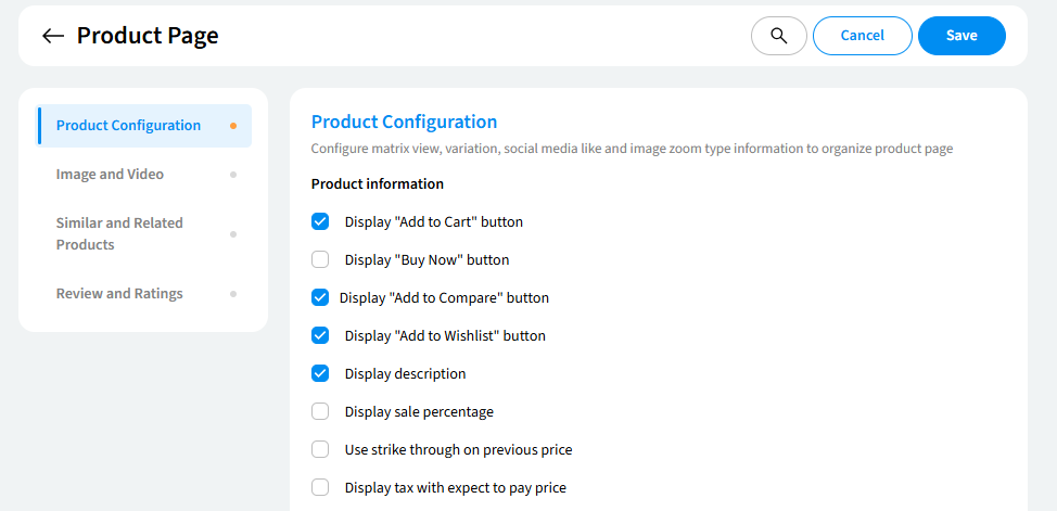 - Navigate to the "Product Configuration" section of your product page settings. Here, you can enable or disable various features like matrix view, variations, social media sharing, and image zoom.