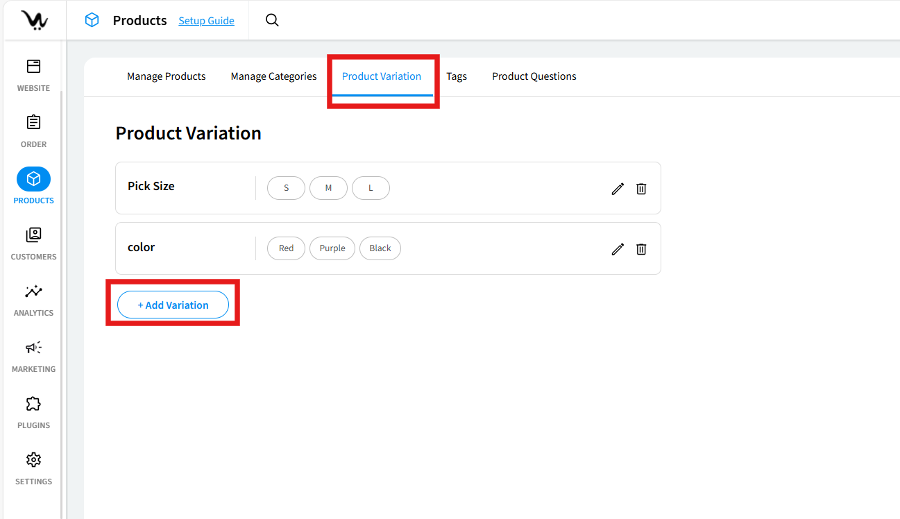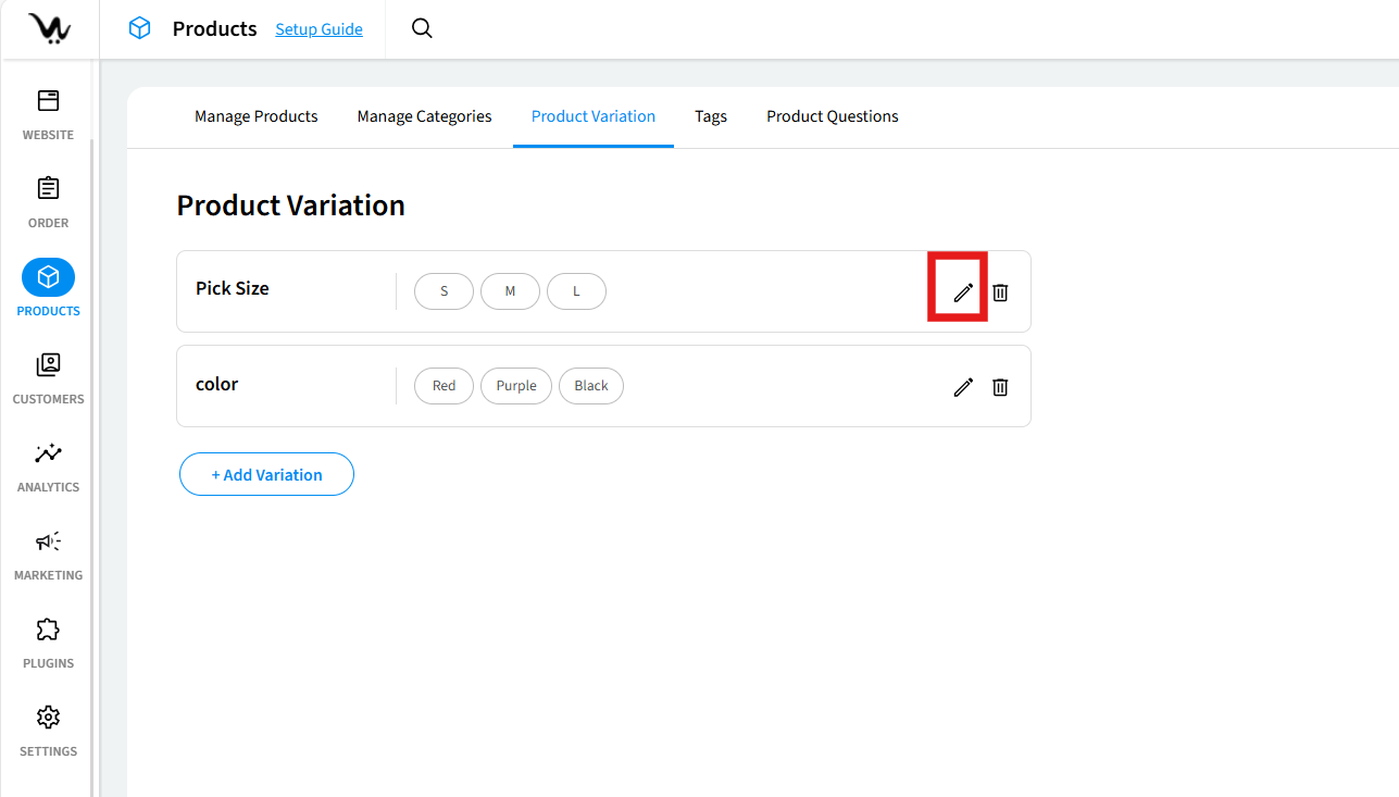 1. In the Product Variation tab, find the variation you want to update and click the pencil icon on the right side of its row.