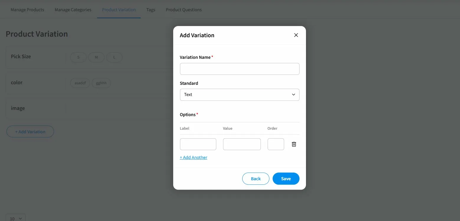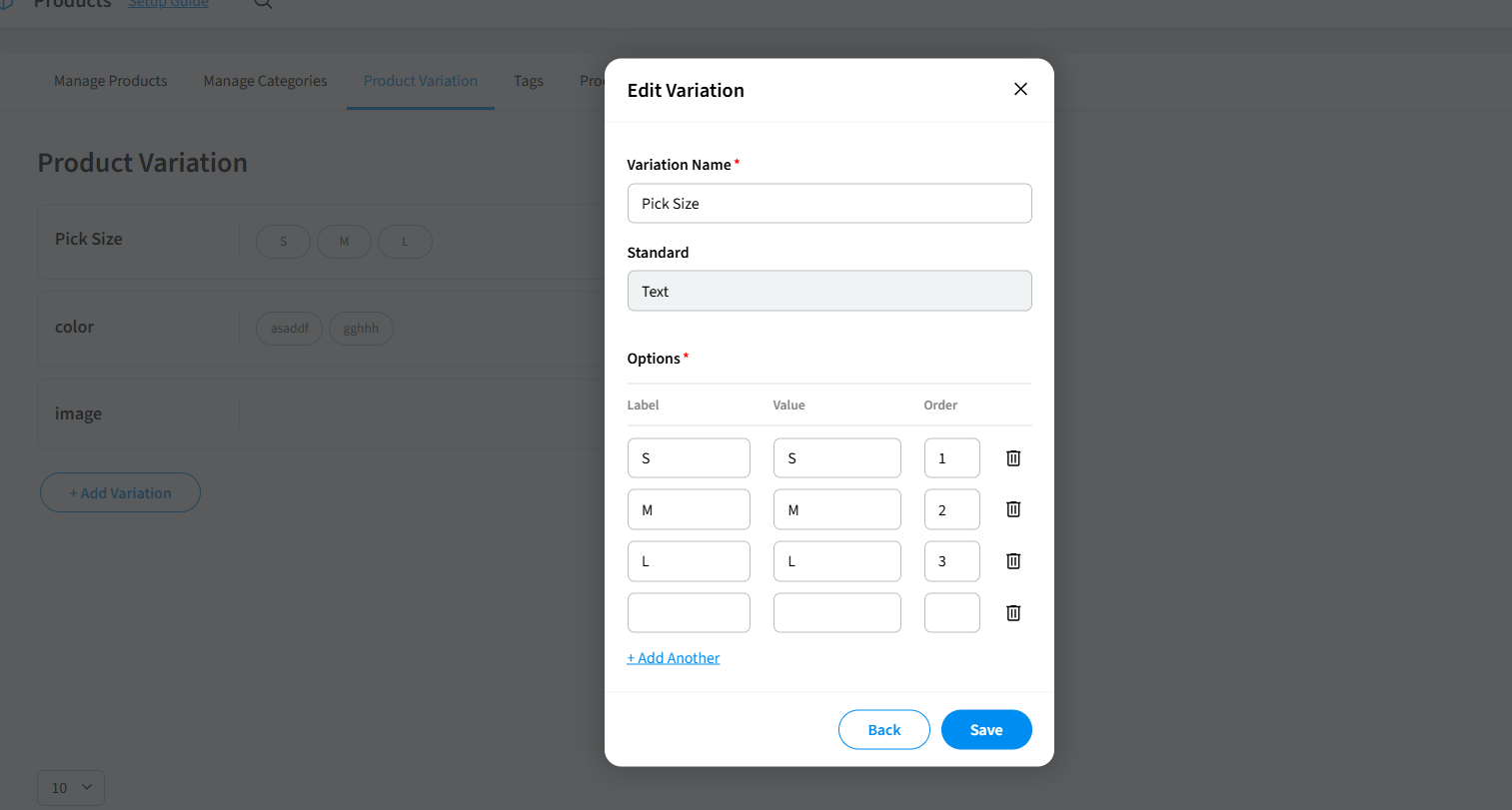 A variation consists of a name (for example, "Pick Size") and a set of options (for example, S, M, and L). Once created, it can be assigned to any product in your store.