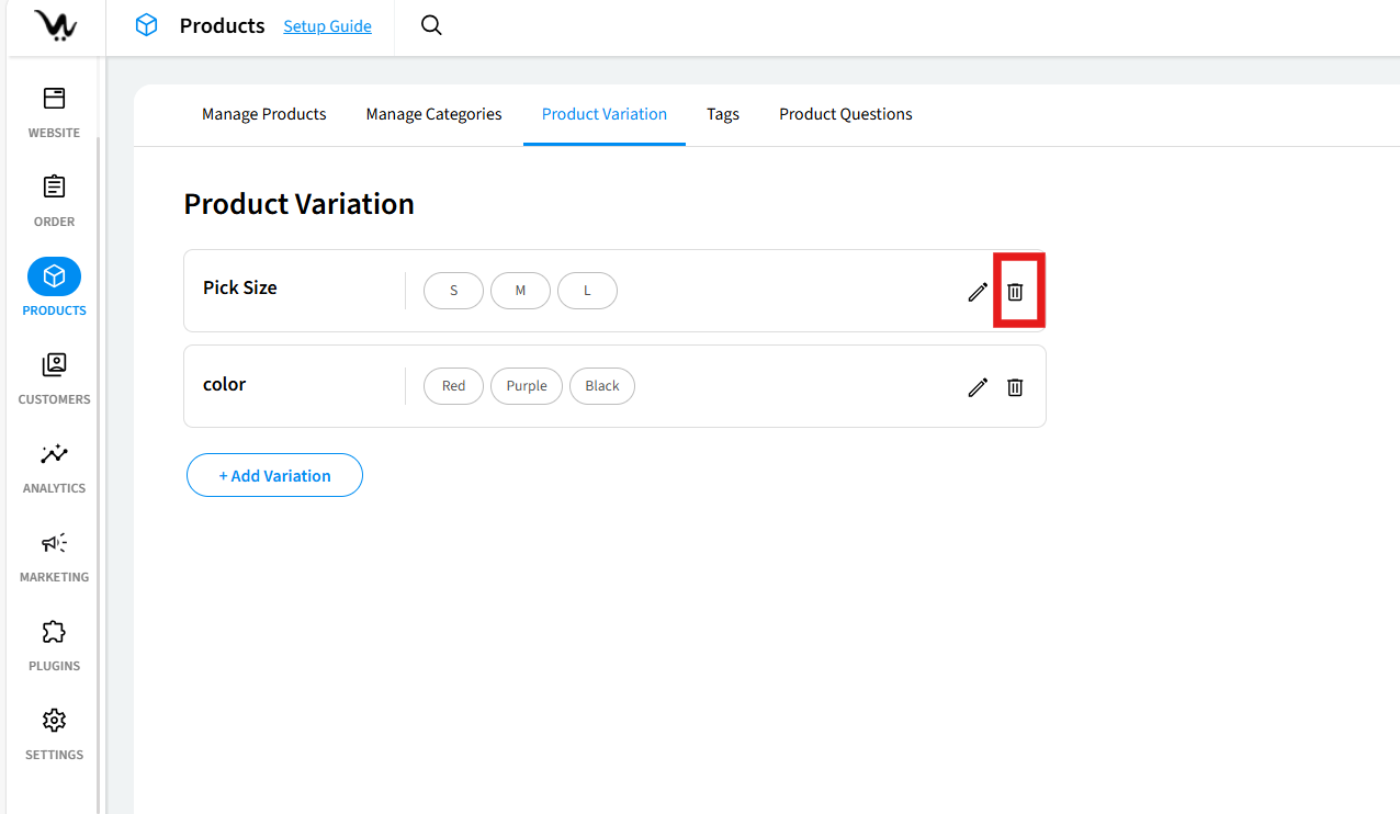 What you'll see: The variation is immediately removed from the Product Variation list.