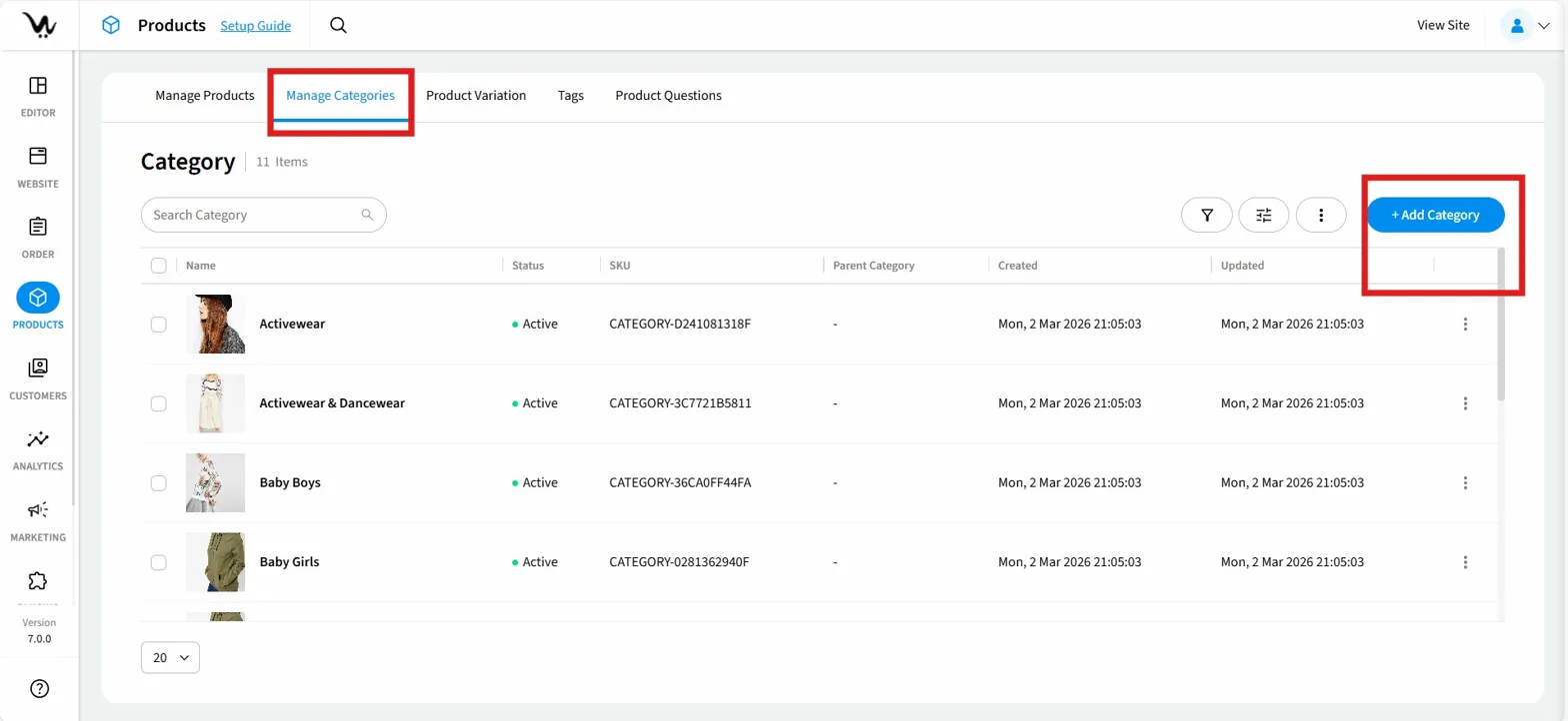 You can create categories to group products in ways that make sense for your store. For example, Clothing by gender or age group, such as Women, Men, or Baby Boys. You can manage all your categories from the Manage Categories tab in the Products section of your WebCommander admin.
