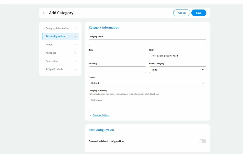 Tip: A unique SKU is automatically generated for every new category (for example, CATEGORY-0F80B9EA0E4). You do not need to enter one manually.