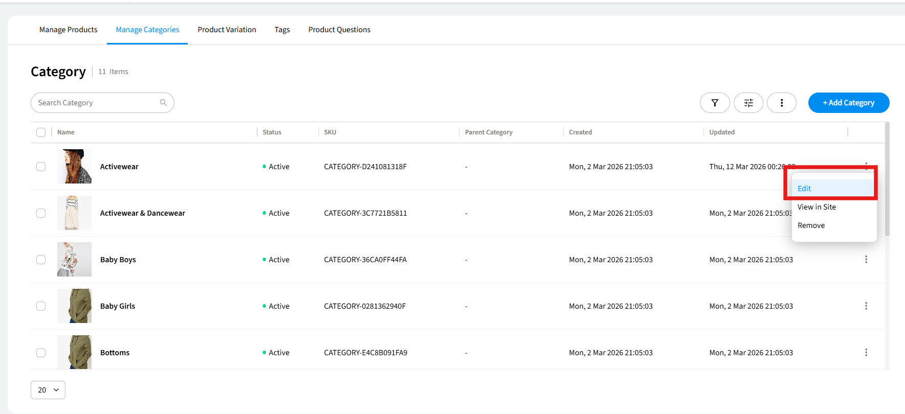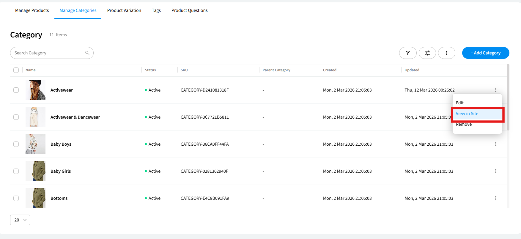 1. In the Manage Categories tab, find the category you want to view and click the ⋮ (three-dot) menu at the end of its row.