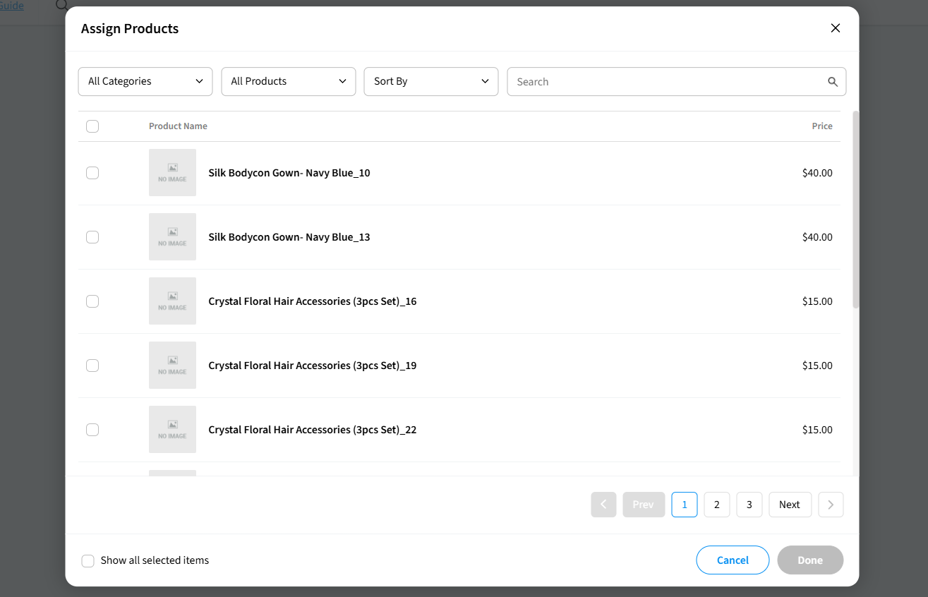 4. The Assign Products popup will appear, showing your full product catalogue. Use the Search bar, All Categories dropdown, or Sort By options to find the products you need.