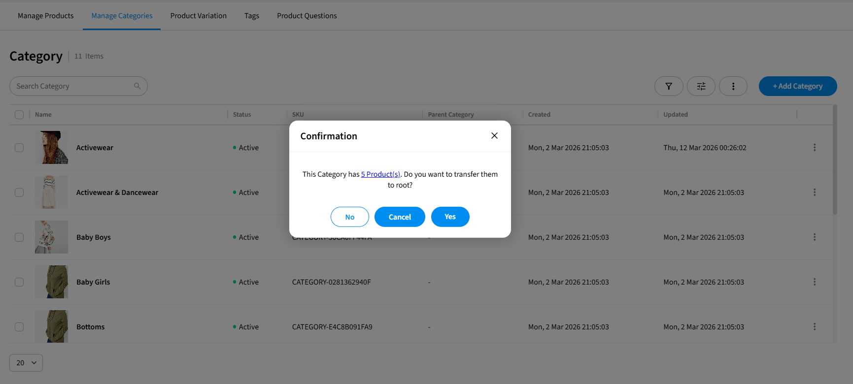 Warning: When you remove a category that has products assigned to it, a confirmation dialog will ask whether you want to transfer those products to root. Clicking Yes moves the products to the top level with no category assigned. Clicking No removes the category without transferring the products. Clicking Cancel cancels the action entirely and keeps the category as it is.
